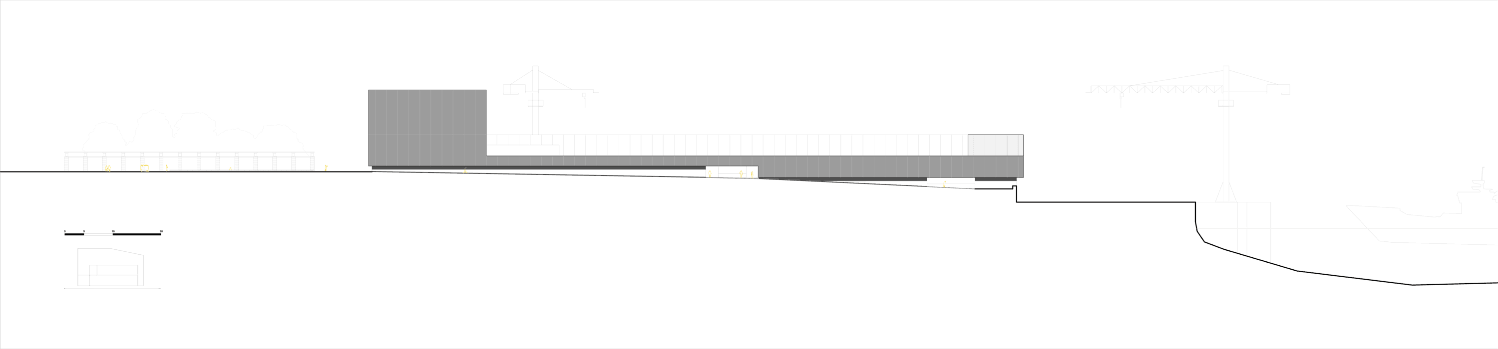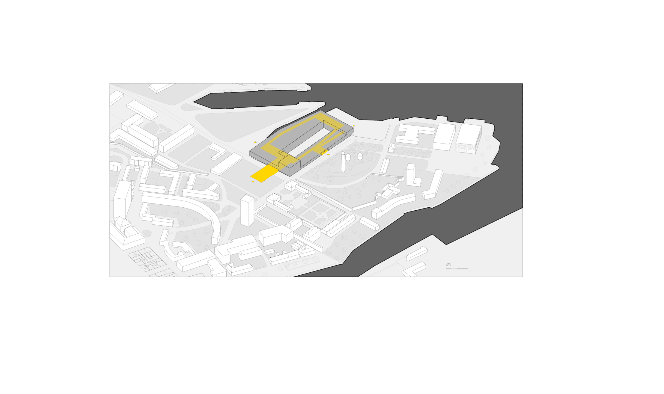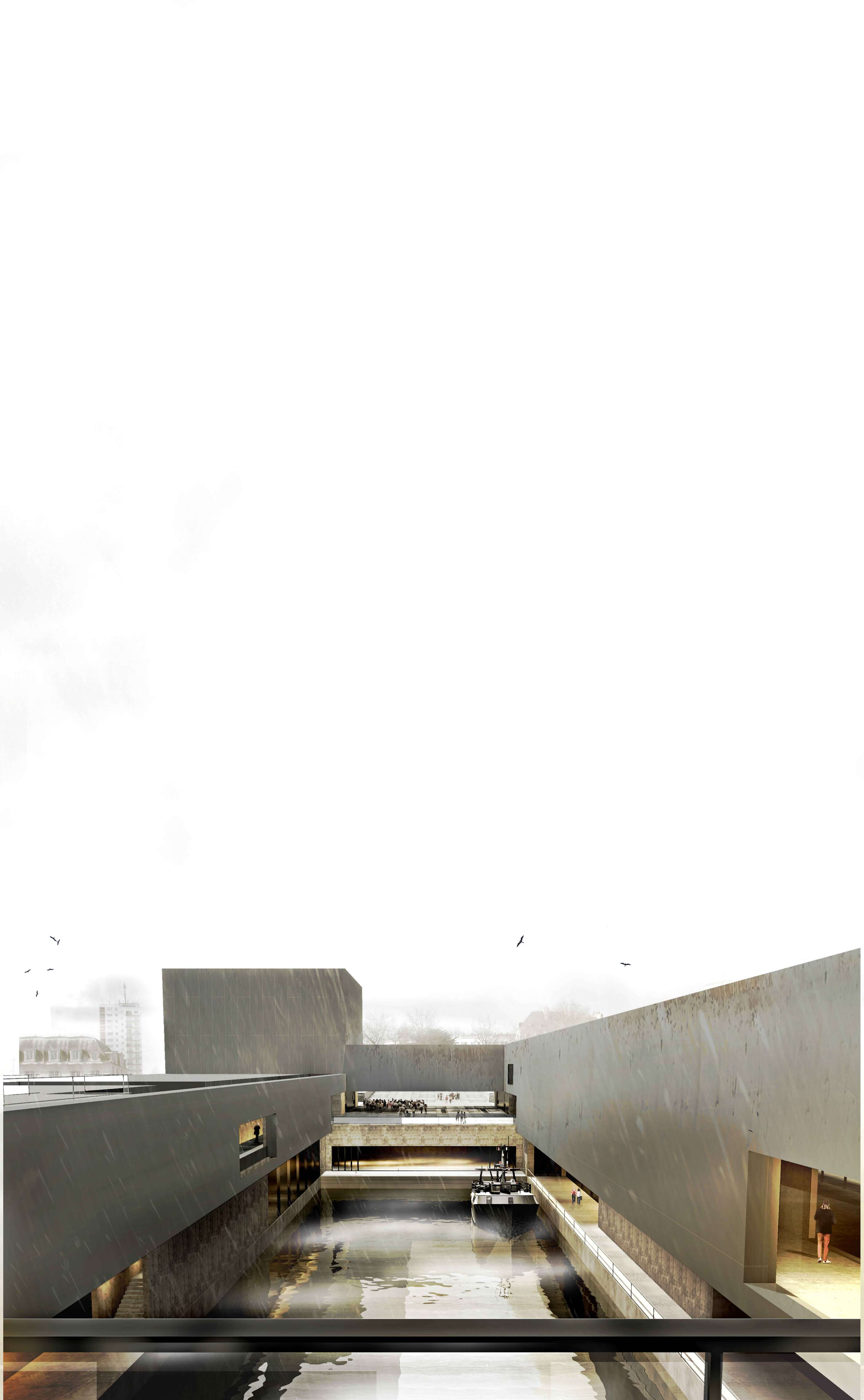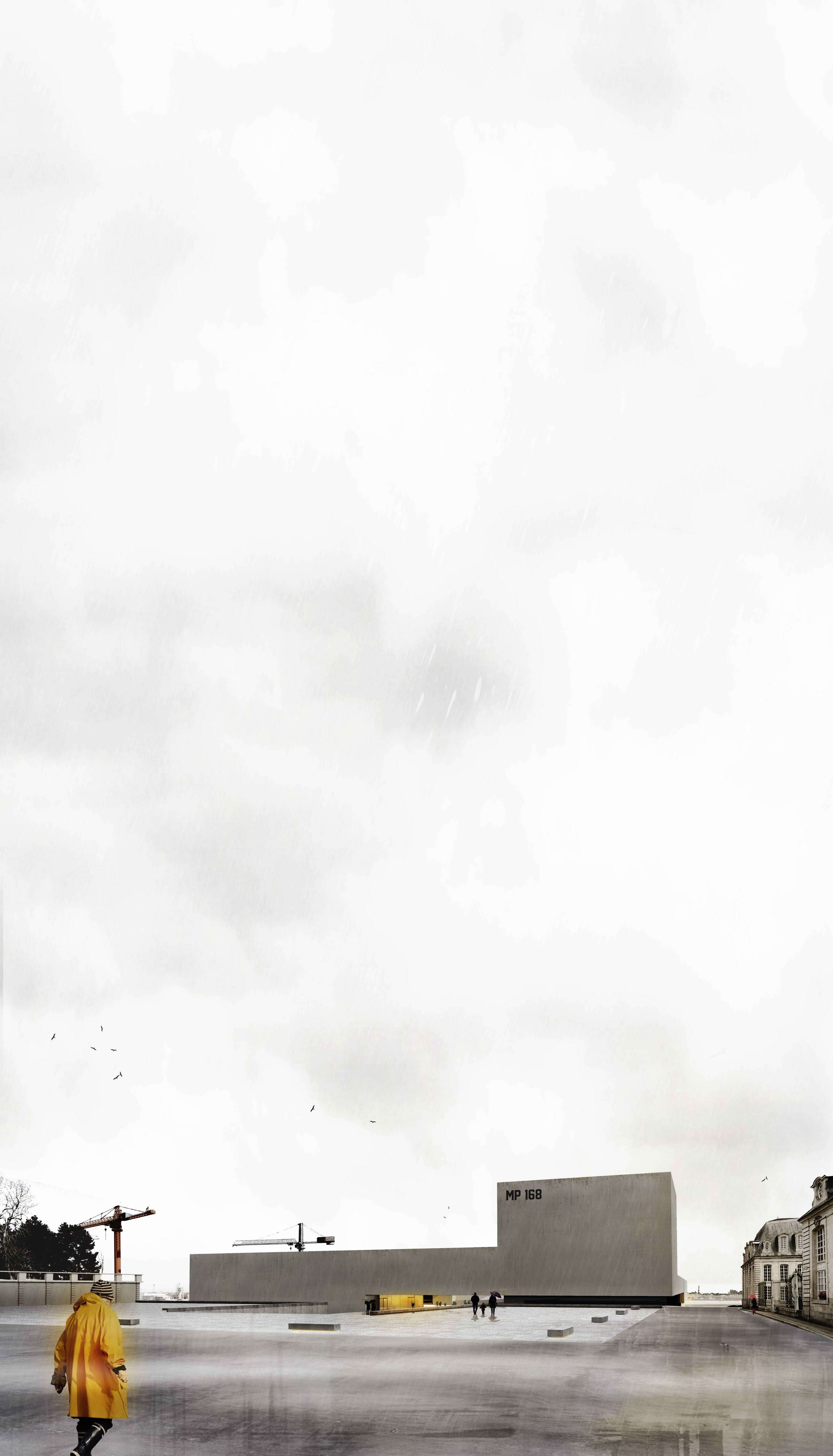 L’histoire de Lorient est directement liée à son espace portuaire. Avant d’être une ville Lorient était un port. Un rapide coup d’œil sur la carte actuelle de la ville, permet d’observer que Lorient est toujours étroitement liée à son port. Aujourd’hui, avec l’ouverture d’une partie de l’ancien arsenal, la ville jouit d’un accès à l’eau inédit. Ce périmètre libéré dit «Zone de l’enclos» constitue une pièce de ville historique , le lieu de fondation de la Compagnie des Indes avant même la fondation de la ville. Cette pointe de terre jouit d’un potentiel nouveau pour la ville de Lorient et son retour vers l’eau. La problématique urbaine du projet repose dans la recomposition d’un lieu urbain dans cette frange ou comment tisser une relation de la ville à l’eau et réciproquement. L’implantation d’un équipement public dans ce site permet d’offrir une nouvelle pièce de ville par un édifice hybride entre musée portuaire et espace public. Pour qu’il participe à la ville en réponse à la problématique énoncée, il convient de remettre en question l’archétype du musée. Alors que le schéma archétypal du musée juxtapose la triade des espaces (accueil, expositions, techniques) depuis un espace public ; MP168 propose une nouvelle relation de l’espace public au musée. A partir des quatre façades, la ville se déploie au sein même du projet, autour de l’eau par un réseau d’espaces et de promenades publiques qui sillonnent le bâtiment. La remise en question d’une typologie classique permet de concevoir une nouvelle typologie d’équipement hybride entre l’espace public et l’architecture. Cette nouvelle typologie s’inscrit comme une nouvelle pièce urbaine offrant une réelle porosité entre les espace ainsi qu’un nouveau rapport urbain à l’eau. Ce nouveau lieu de déambulation compose un nouveau paysage fait de surprises et de contrastes. Au sein de ce paysage la promenade publique et la promenade scénographique s’entremêlent, se croisent et s’entrechoquent