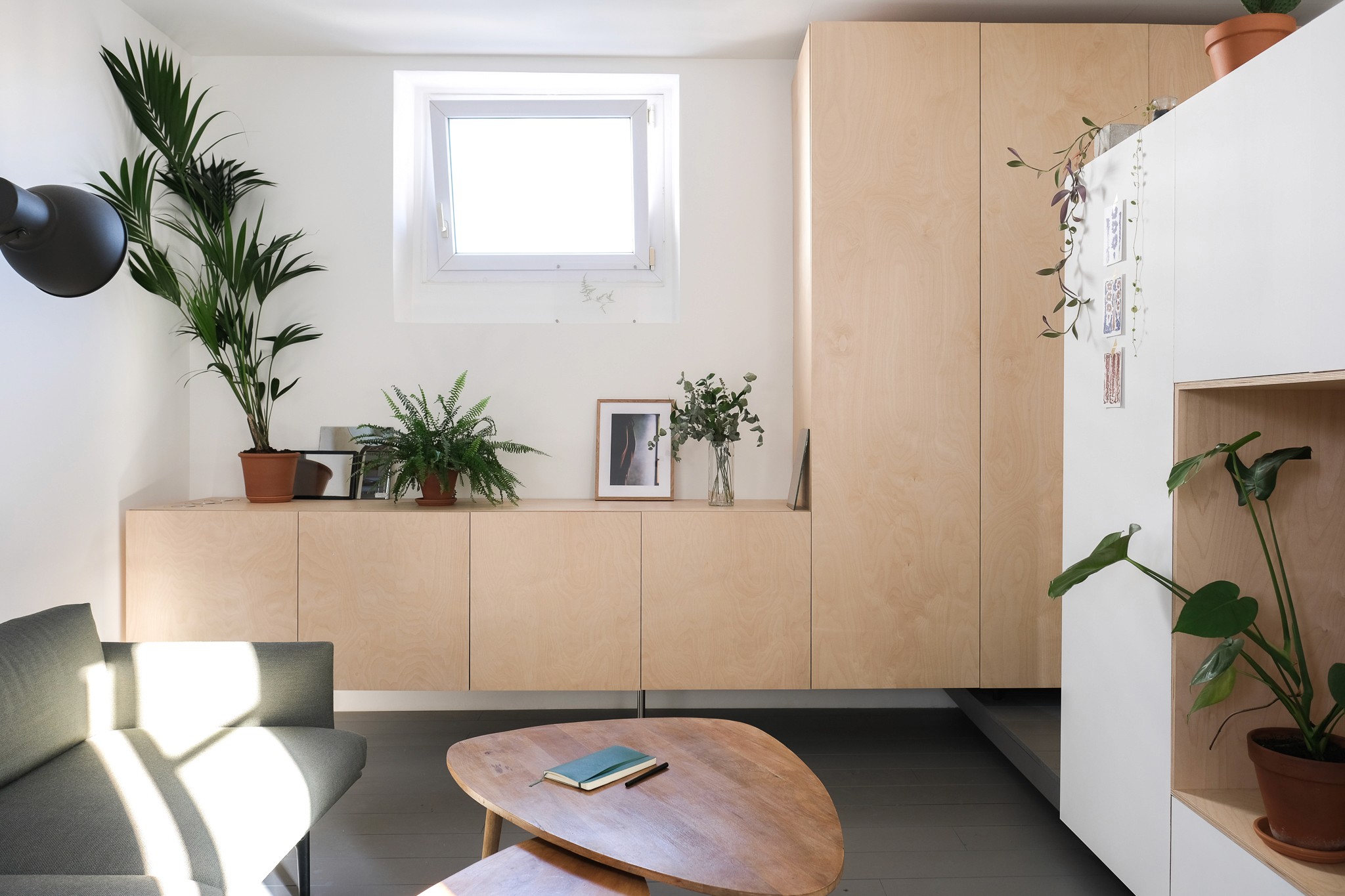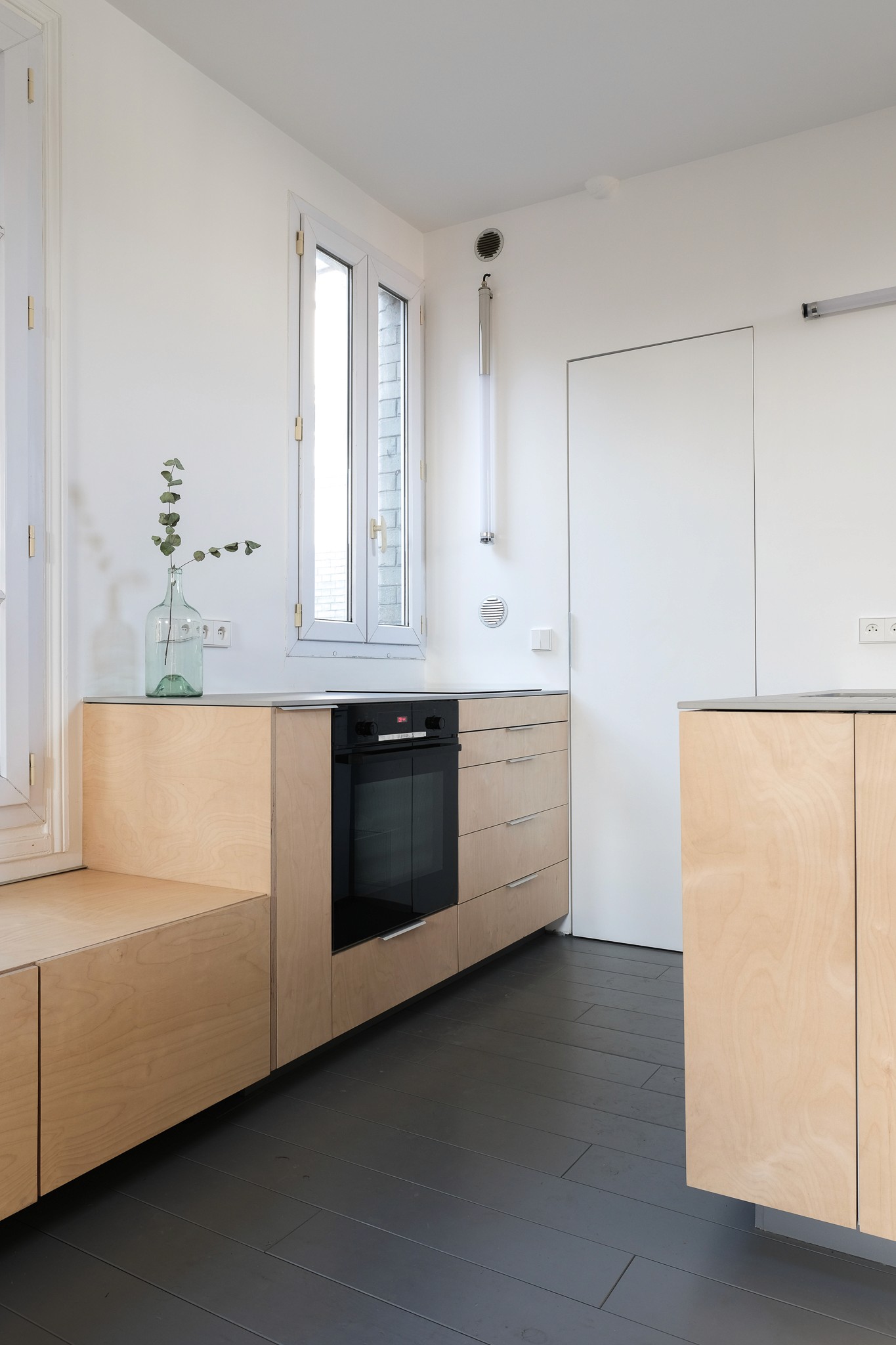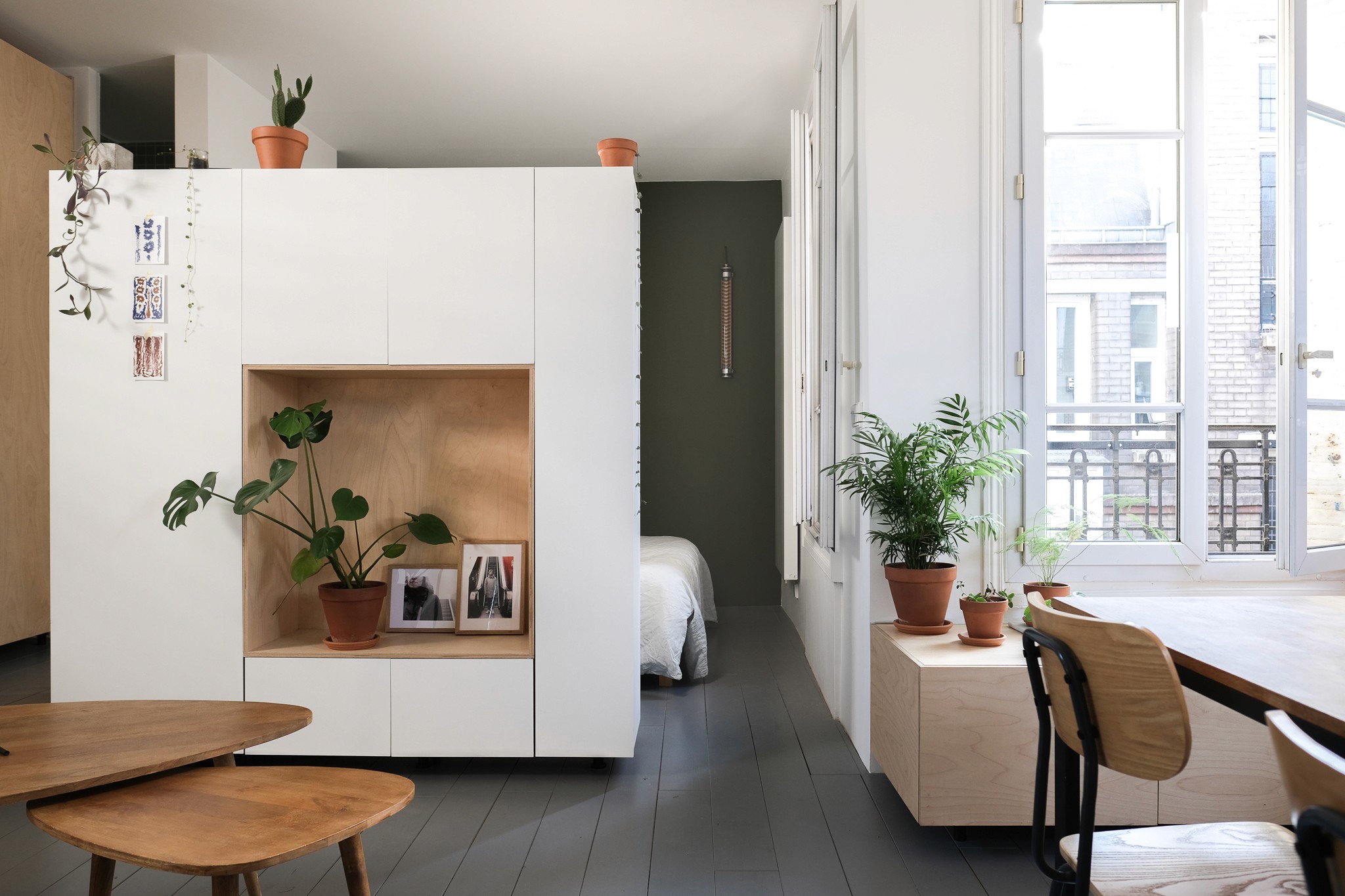 L’appartement se situe au 5ème étage d’un immeuble du début du XXème siècle dans le quartier Marx Dormoy dans le 18ème arrondissement de Paris. Nous sommes en présence d’un volume simple dont la morphologie en L permet des vues directes et biaises sur de grandes longueurs. De plus, des ouvertures sur quatre orientations permettent à la lumière naturelle d'inonder le volume tout au long de sa course quotidienne. Dès l’origine du projet il est décidé de faire tabula rasa de ce qui a pu préexister. L’ensemble des cloisons est abattu pour redonner une base neutre ou les seuls acteurs seront désormais lumière et mouvement. Le volume conservé ouvert dans sa totalité joue désormais comme un grand réflecteur de lumière naturelle. Trois ensembles disposés dans l’espace suffisent à définir espaces et usages, déplacements et mouvements. Ce nouvel aménagement pensé comme un paysage intérieur donne lieu à des espaces continus mais dissociés. La circulation du regard à travers de grandes lignes de fuites et la circulation du corps sans impasse participe à la sensation de grande spatialité. La réduction des éléments, des matières et des teintes à la plus grande simplicité génère une atmosphère douce et paisible. Un sol gris uni abstractise le plan horizontal. Tandis que l’ensemble des murs sont blancs. L’utilisation du bouleau pour les meubles sur mesure permet de les dissocier du volume d’origine. Celui-ci qui est toujours redonné à lire dans sa plus simple définition volumétrique.